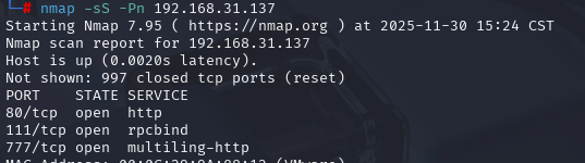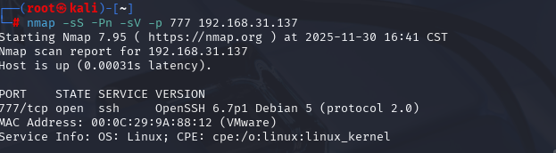 有一个777端口的服务,第一次扫描nmap也不知道具体是什么服务,而且这个没有ssh服务,我们用-sV在单独扫一次