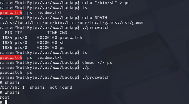 1 | echo "/bin/sh" > ps |